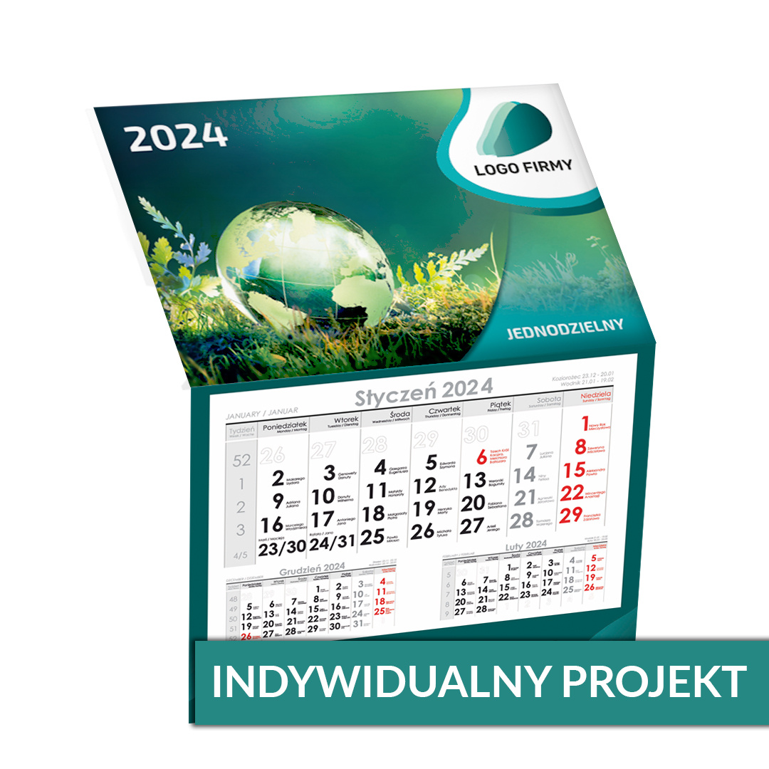 Kalendarz ścienny z funkcjonalnym układem jednodzielnym - widok na 3 miesiące. Praktyczny kalendarz z personalizowaną grafiką firmową na główce i pleckach. Indywidualny projekt graficzny, szerokie możliwości projektowe. Funkcjonalny znacznik daty oraz dedykowany do zawieszenia otwór na główce kalendarza.