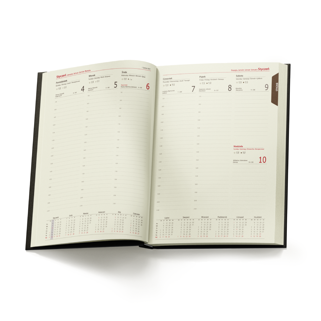 • Układ: Tygodniowy (144 strony + 8 stron z mapami)