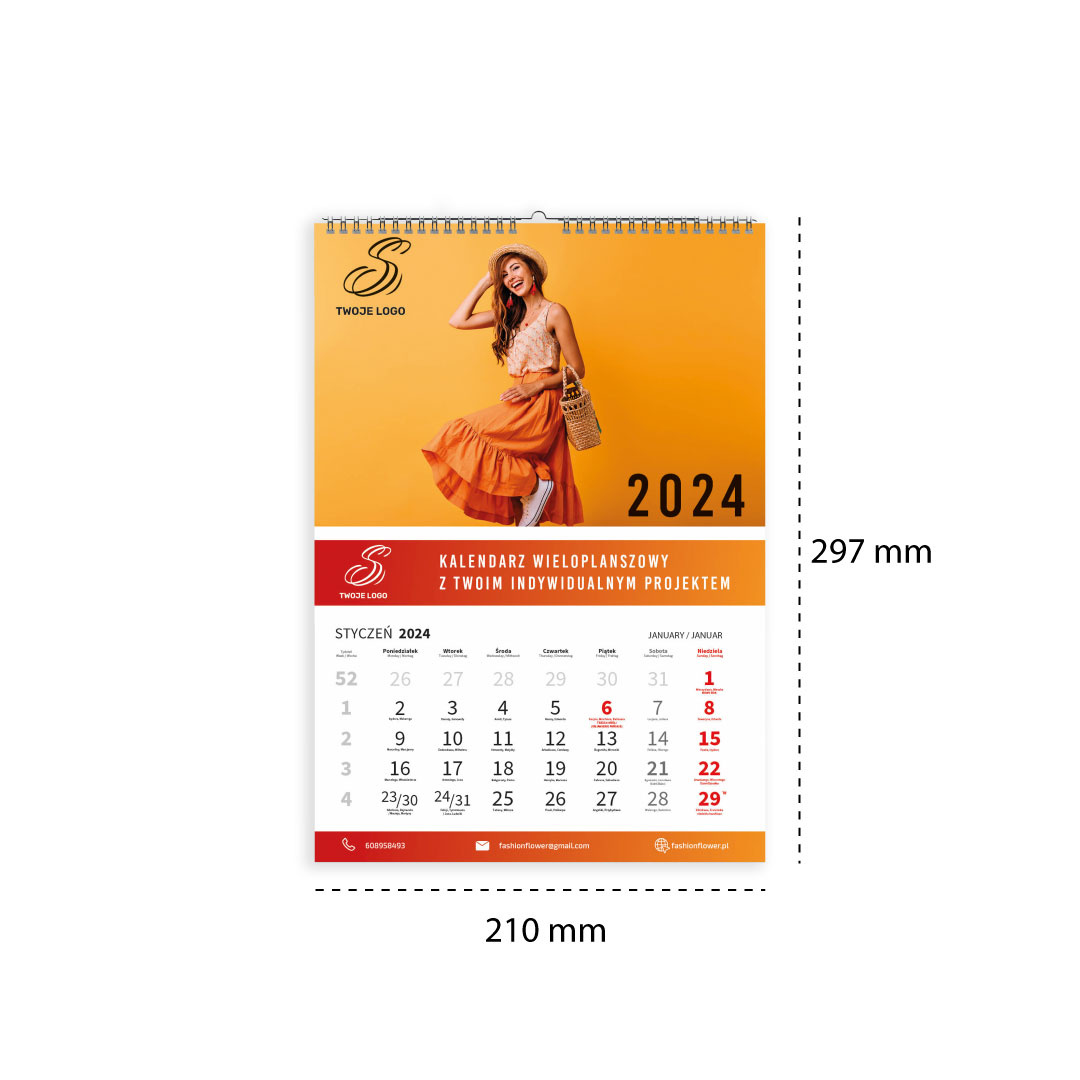Ten kalendarz został zaprojektowany w formacie A4, co oznacza, że ma standardowe rozmiary, które są wygodne do przechowywania i przeglądania. Składa się z siedmiu kart, z których każda jest dwustronnie drukowana - każdy miesiąc na jednej stronie + okładka. Całość przeznaczona do personalizowanego projektu graficznego.