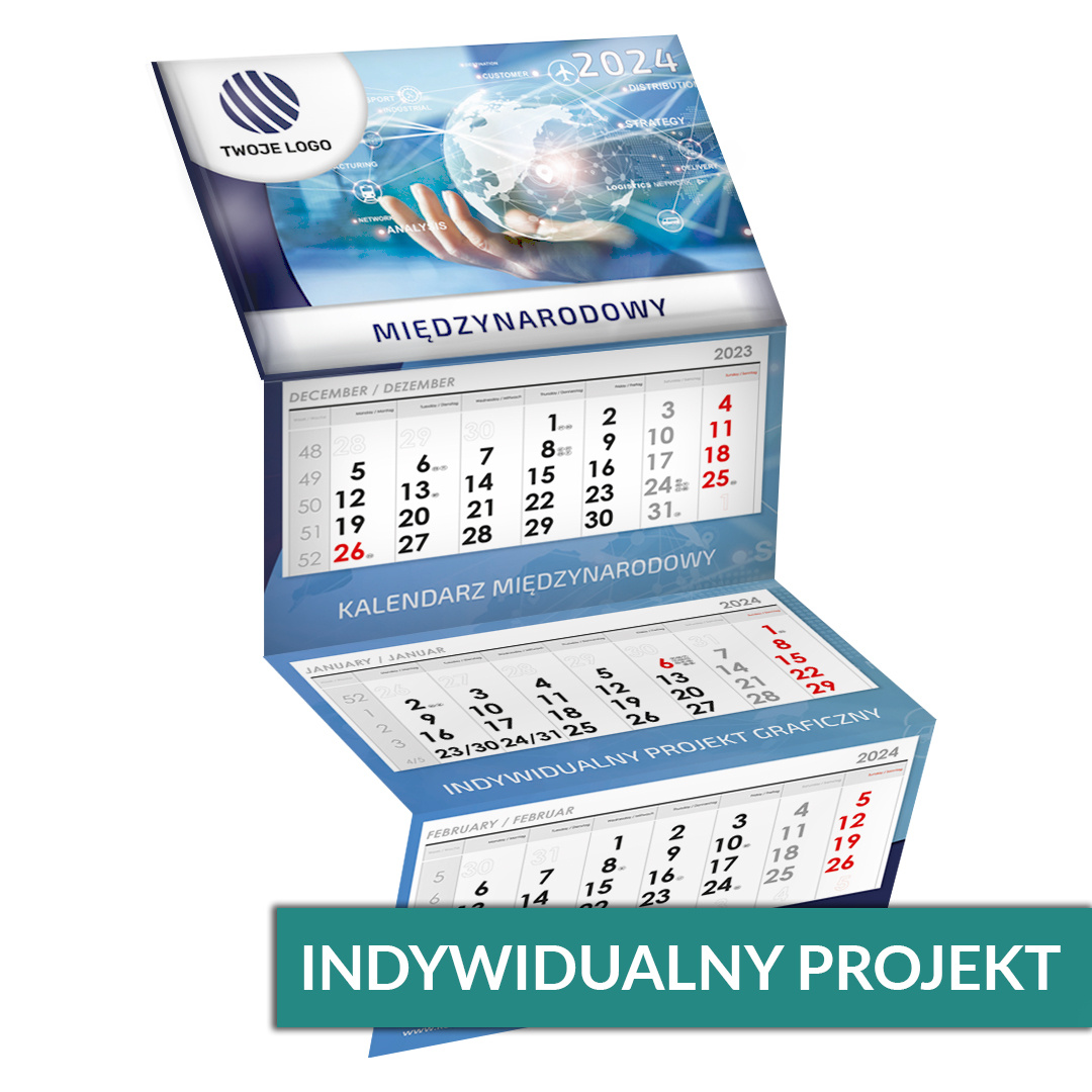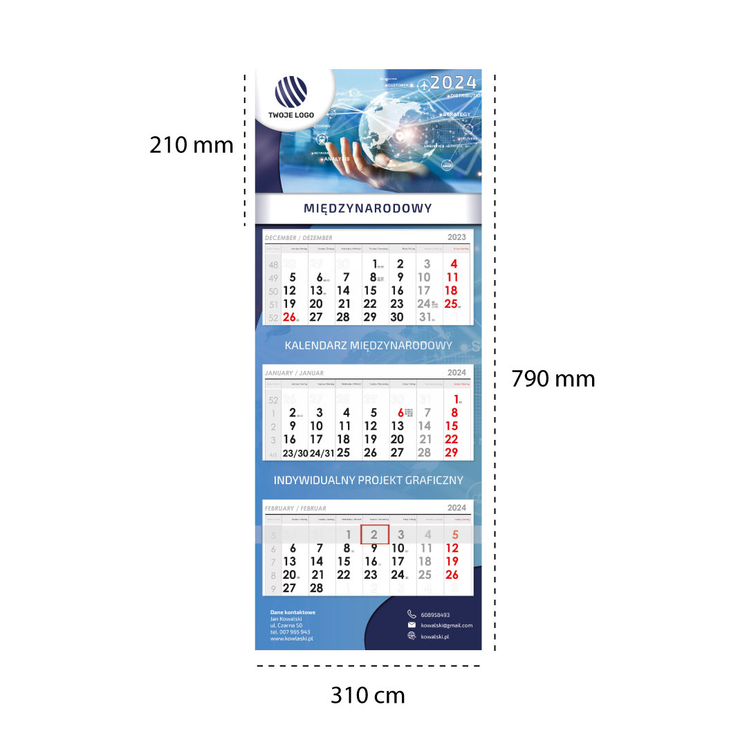 Kalendarz ścienny z funkcjonalnym układem trójdzielnym - widok na 3 miesiące. Ekologiczny i praktyczny kalendarz z personalizowaną grafiką firmową na główce i pleckach. Indywidualny projekt graficzny, szerokie możliwości projektowe. Funkcjonalny znacznik daty oraz dedykowany do zawieszenia otwór na główce kalendarza.