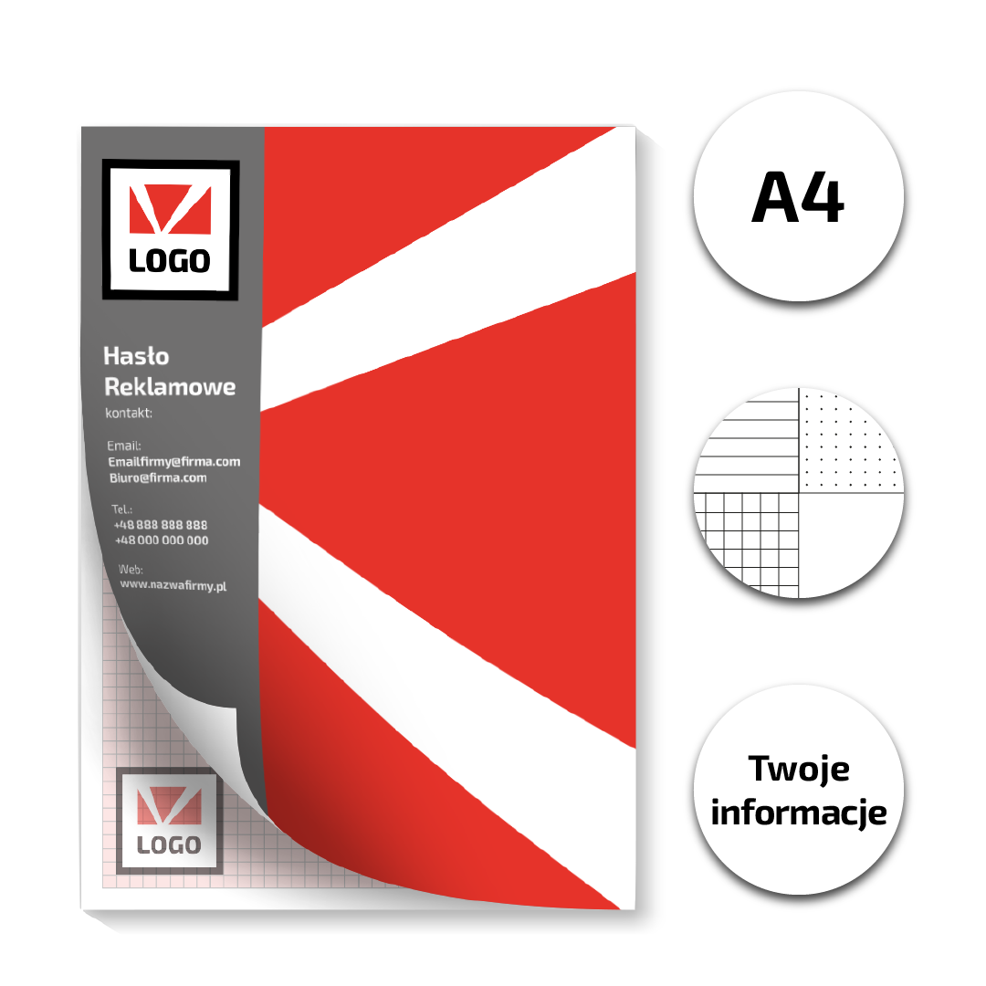 Na spodzie każdego notesu przyklejony jest karton o gramaturze 210g, co dodatkowo wzmacnia notes i sprawia, że jest bardziej odporny na zgniecenia i uszkodzenia. Na wierzchniej części notes posiada okładkę z 170 g papieru kreda mat, z indywidualnym projektem graficznym.