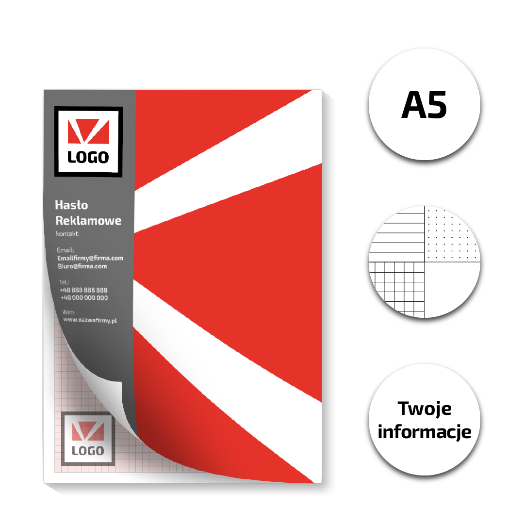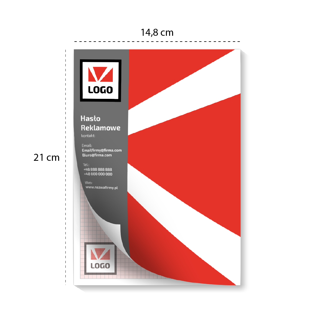 Na spodzie każdego notesu przyklejony jest karton o gramaturze 210g, co dodatkowo wzmacnia notes i sprawia, że jest bardziej odporny na zgniecenia i uszkodzenia. Na wierzchniej części notes posiada okładkę z 170 g papieru kreda mat, z indywidualnym projektem graficznym.