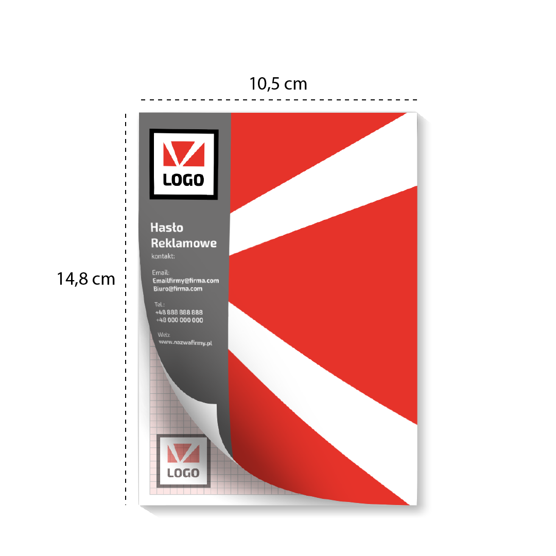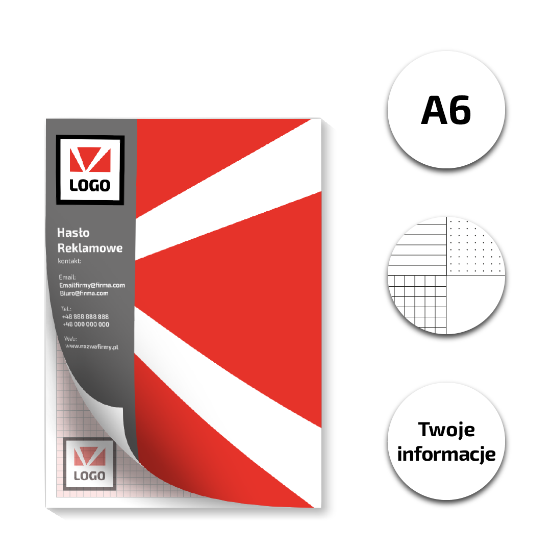 Na spodzie każdego notesu przyklejony jest karton o gramaturze 210g, co dodatkowo wzmacnia notes i sprawia, że jest bardziej odporny na zgniecenia i uszkodzenia. Na wierzchniej części notes posiada okładkę z 170 g papieru kreda mat, z indywidualnym projektem graficznym.